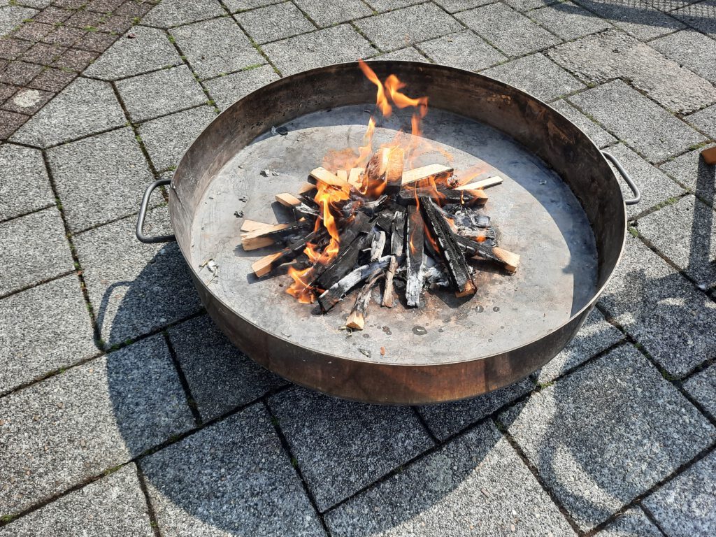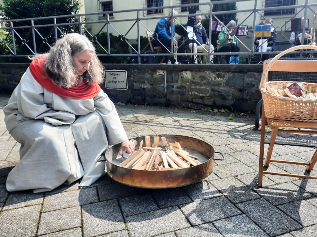 Einige Gottesdienstteilnehmer*innen trugen vor, was es für sie bedeutet, für ihren Glauben „Feuer und Flamme“ zu sein. Während des Liedes „Du Herr gabst uns dein festes Wort“ konnten dann alle durch das Legen von Holzscheiten in eine Feuerschale symbolisch Feuer entfachen – ein kraftvolles Bild für den Heiligen Geist und den Glauben.