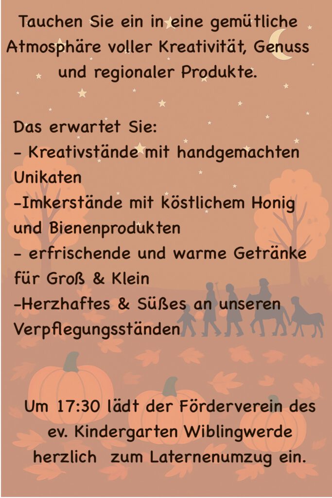 Zum Abschluss des Tages lädt der Förderverein des Evangelischen Kindergartens Wiblingwerde um 17:30 Uhr herzlich zum Laternenumzug ein – ein besonderes Highlight für Kinder und Familien.