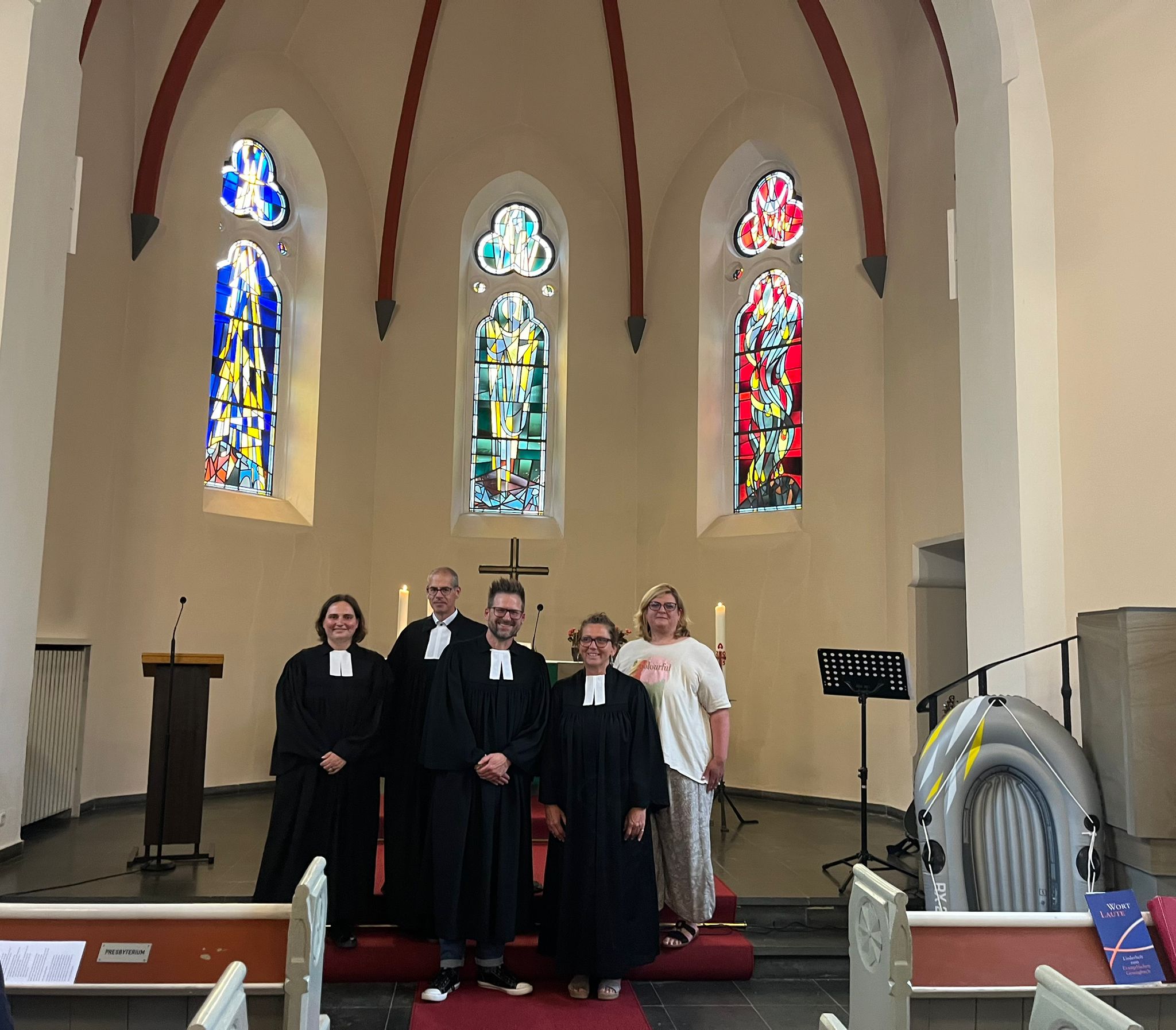 Ein zentrales Bild des Abends: ein Schlauchboot, das sinnbildlich durch die Kirche getragen wurde. Damit machten die neuen Mitarbeitenden und die Gemeinde deutlich: Man bricht gemeinsam auf – auch wenn das Gewässer nicht immer ruhig ist.